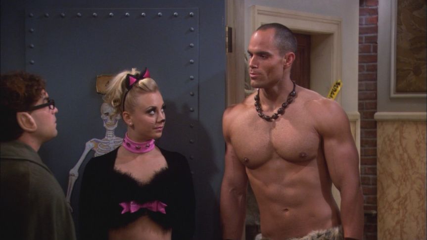 Leonard (Johnny Galecki) and Penny's ex-boyfriend Kurt (Brian Patrick Wade) confront each other at her Halloween party.