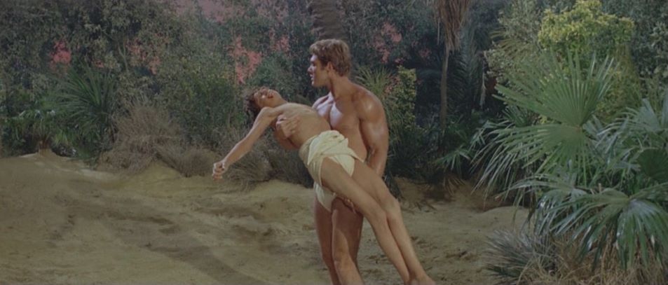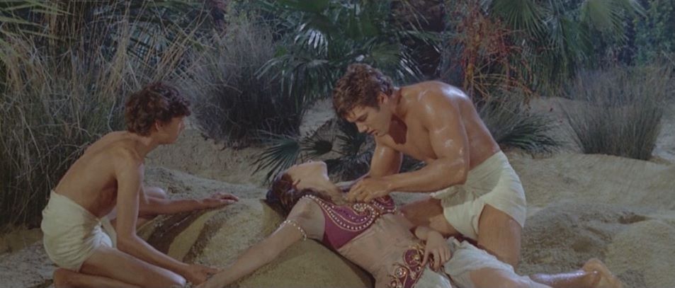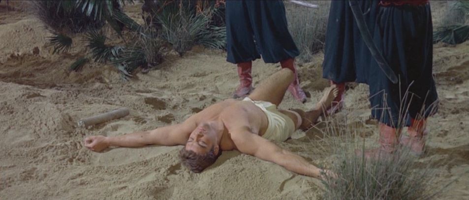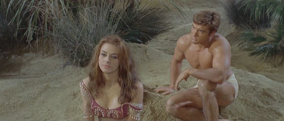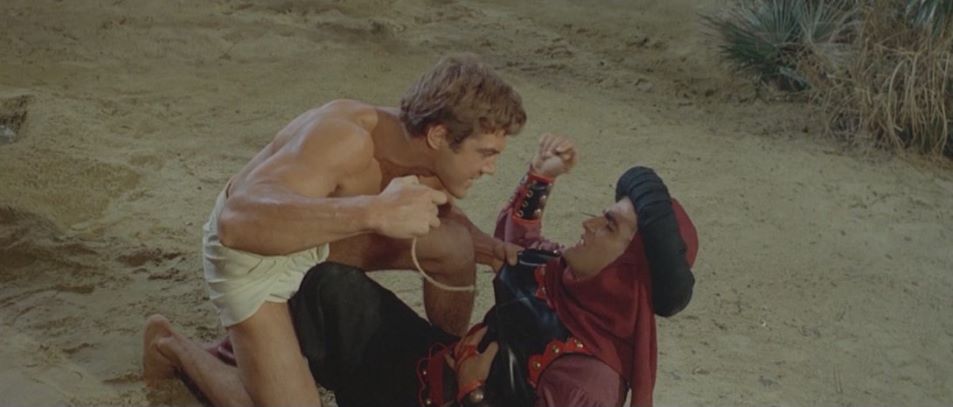 Kirk Morris (The Witch's Curse) stars as a desert nomad who helps a princess regain her father's throne after he is murdered by an evil usurper. He discards his loincloth early on in favor of a more traditional "Arabian Nights" style of garb. He later battles a savage rhinoceros in a pit and has a climatic showdown with the film's villian in a hall of mirrors.