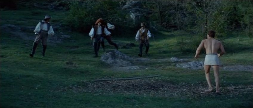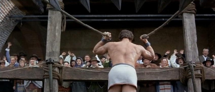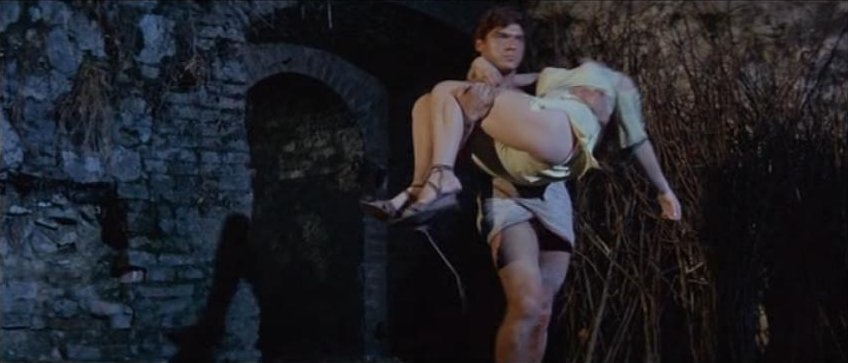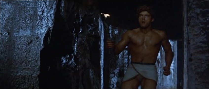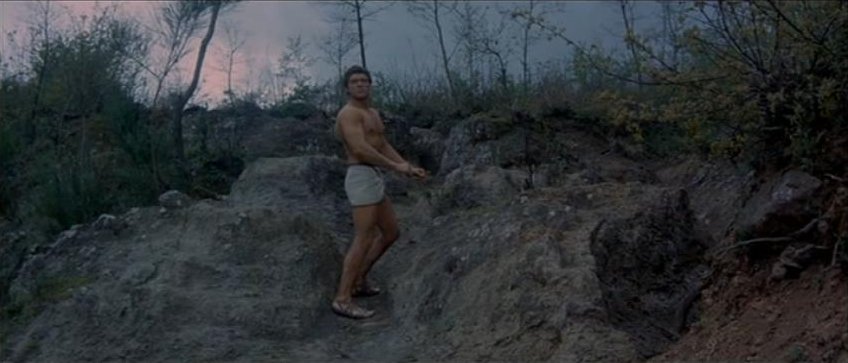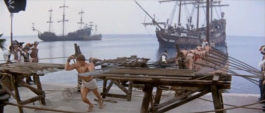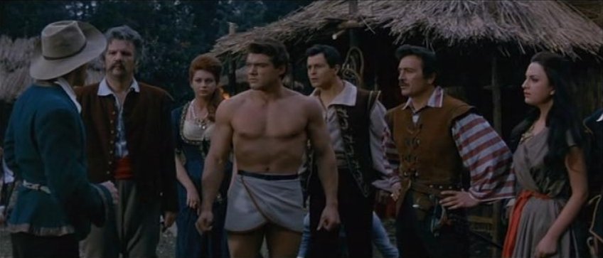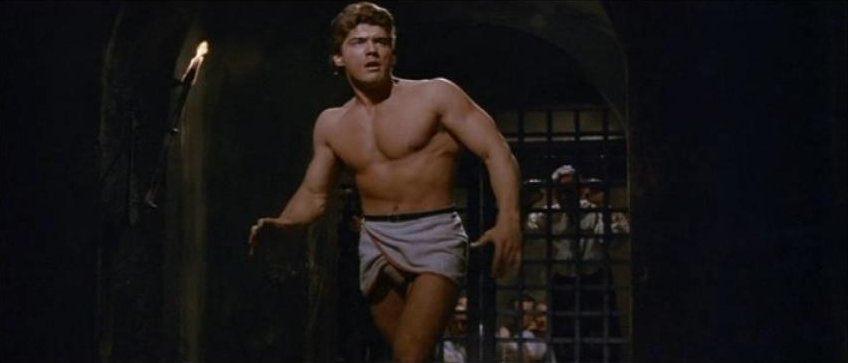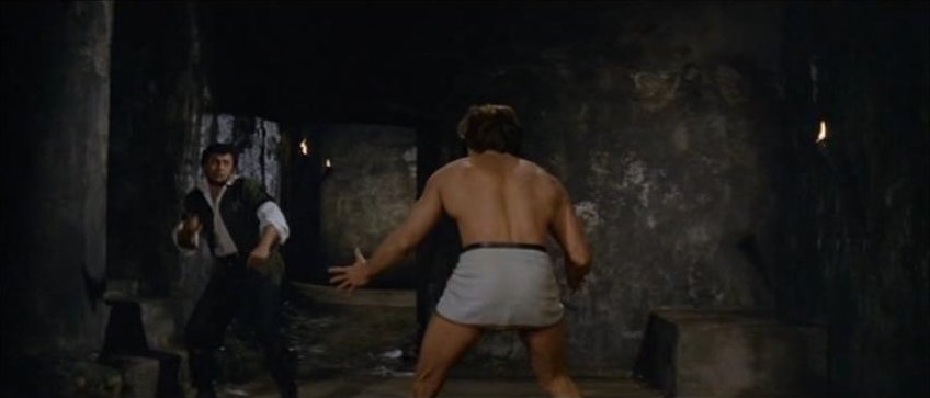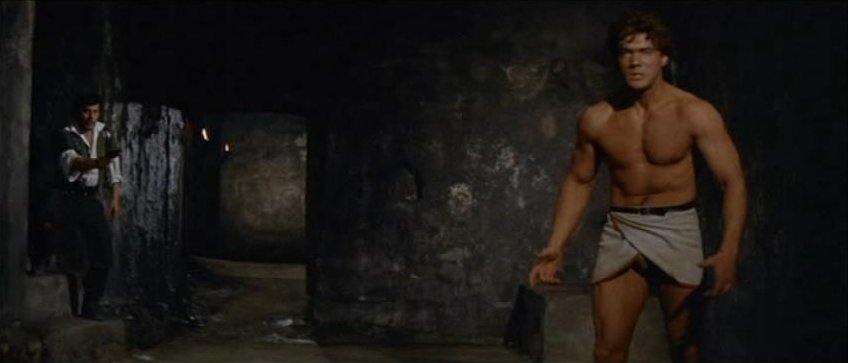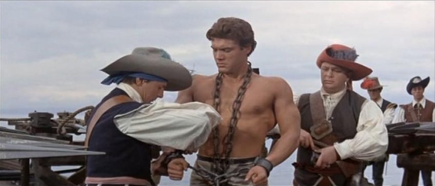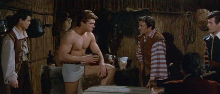 Kirk Morris stars in this Italian swashbuckling adventure, also released as Samson Against the Pirates and Samson vs. the Pirates. For the first half of this 89 minute film the muscular star mostly wears period garb consisting of a leather vest and pants with knee-high black boots. It's not until Samson is taken captive by pirates that the actor reappears chained, wearing sandals and a loincloth.
